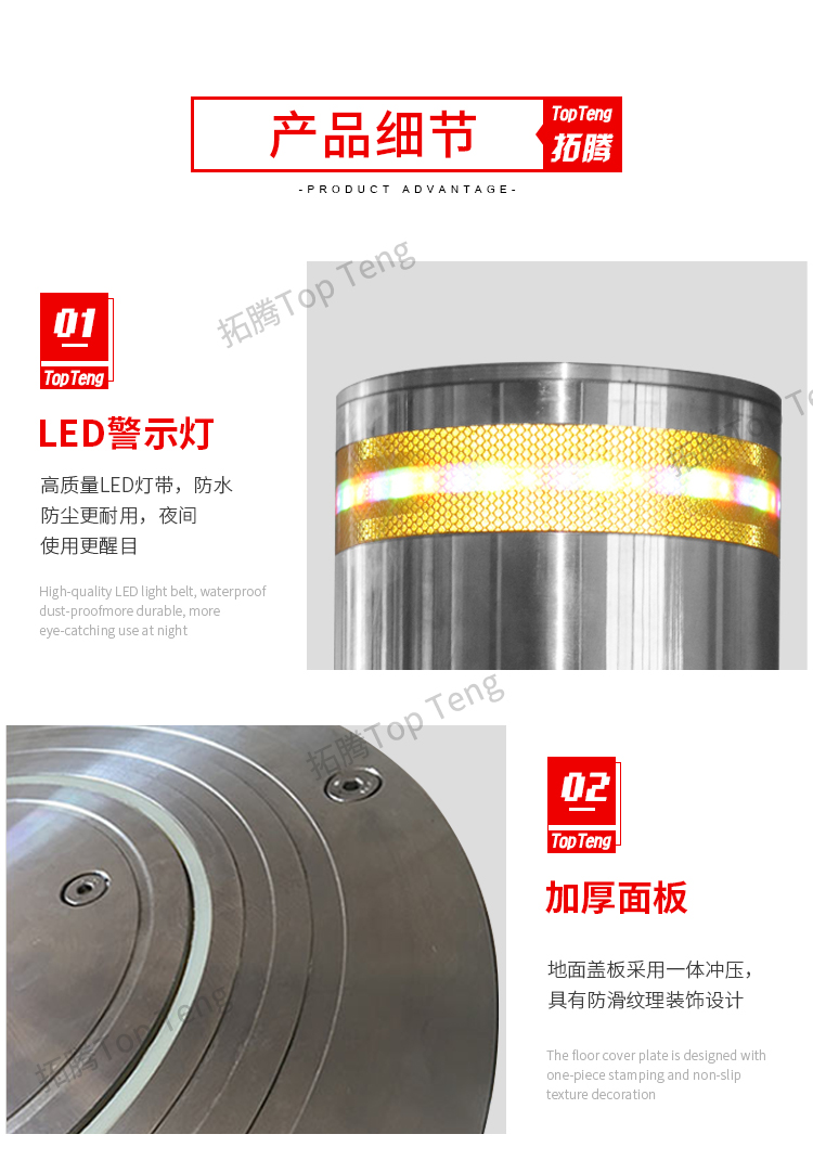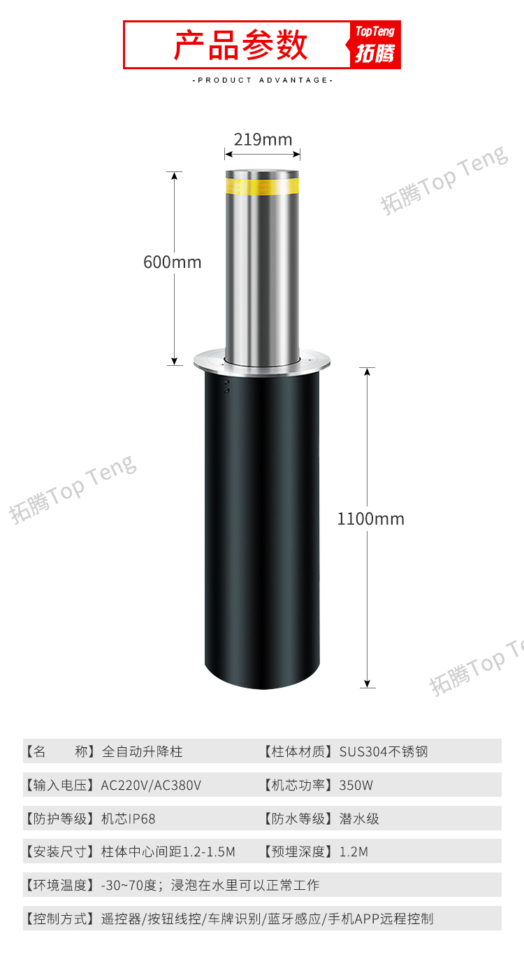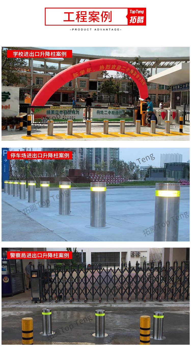 拓騰TP-S219全自動升降柱是我司最新研究,專用于智慧停車場的防控防撞智能升降柱,智能安全升降柱廣泛應用于學校,小區,公園,風景區,機關單位,消防通道廣場,停車場,使用遙控來進行操作就可以實現升降,而且由于升降柱所選用的材質非常堅固,因此還可以有效的攔截機動車的故意沖撞猛闖等行為。